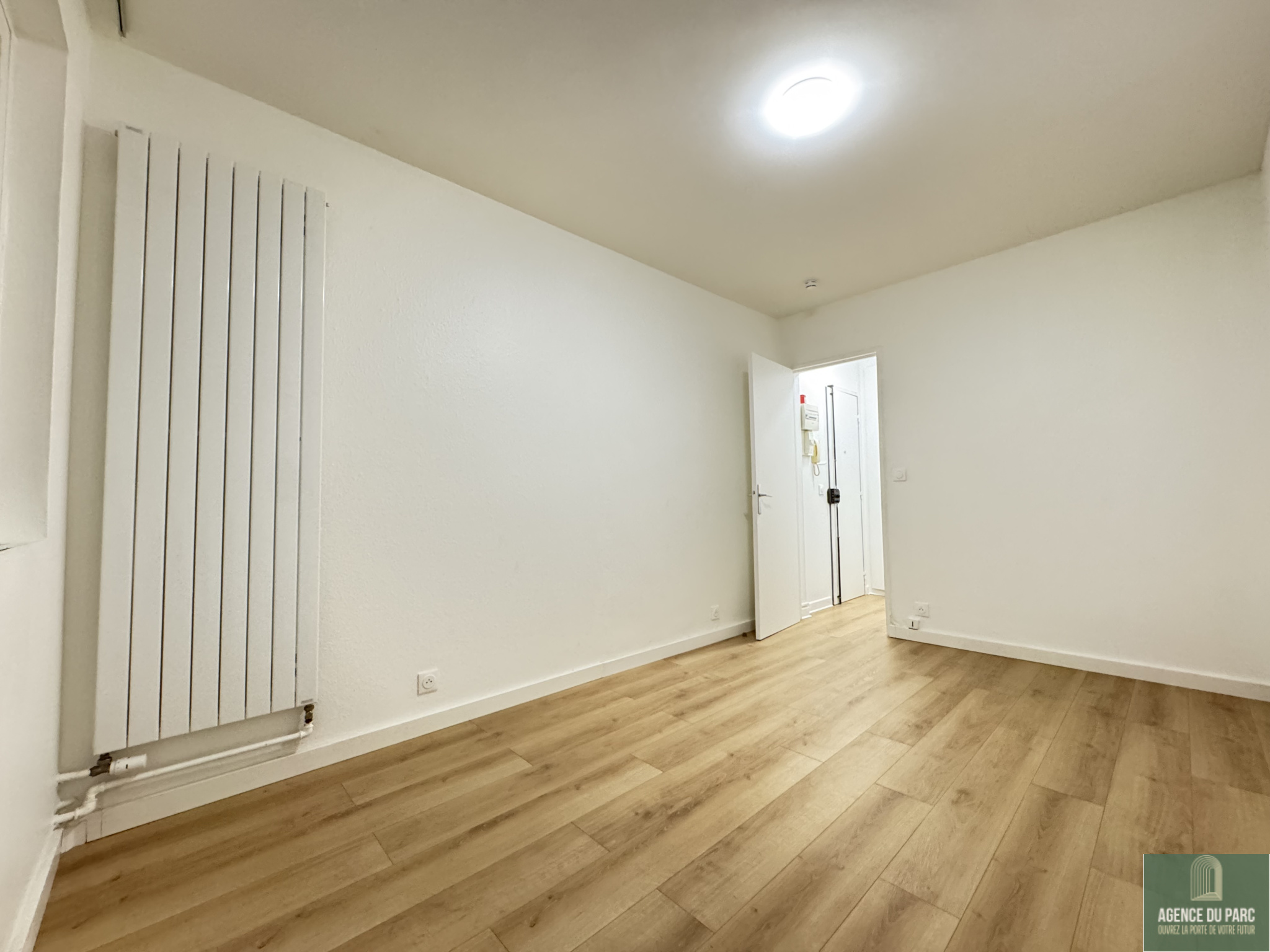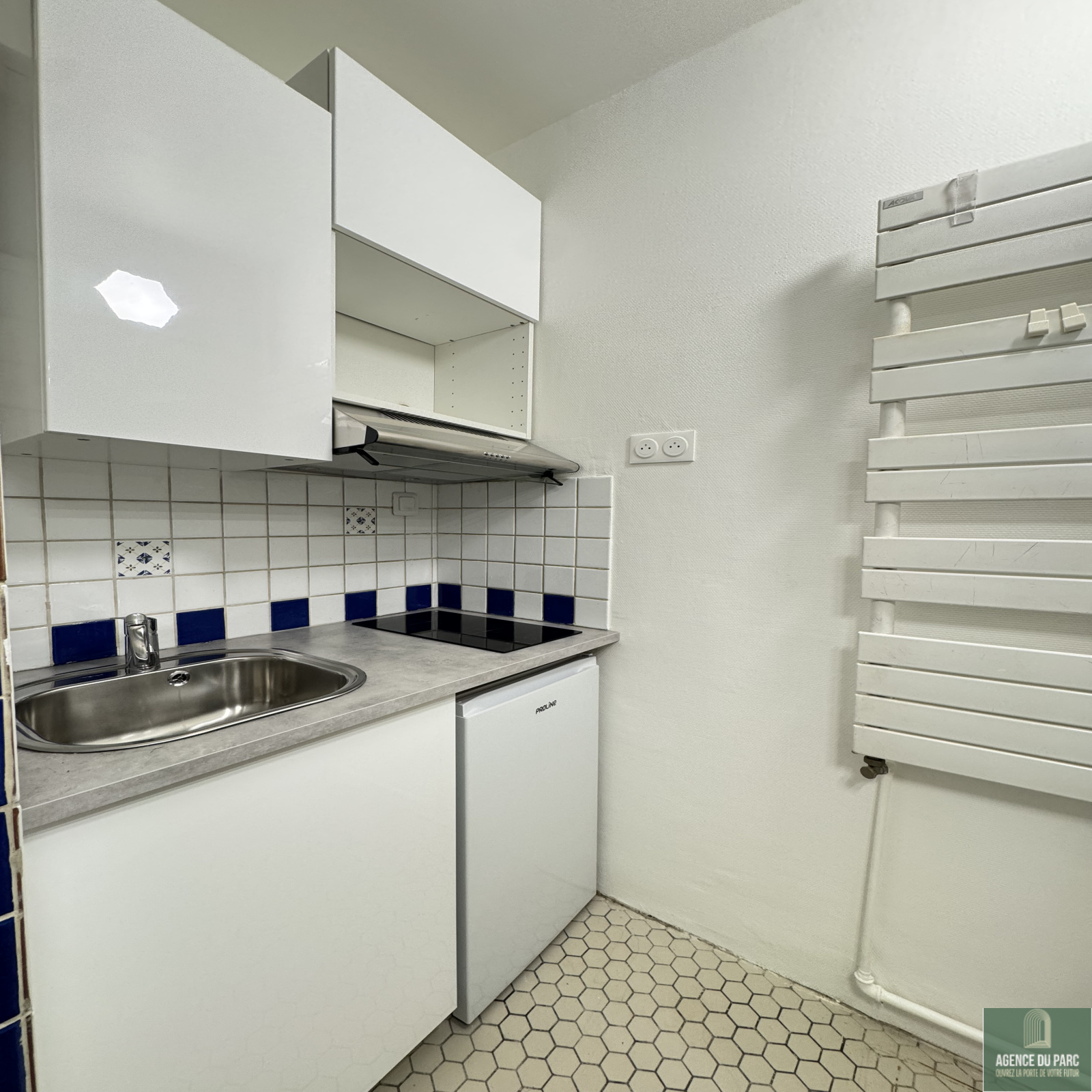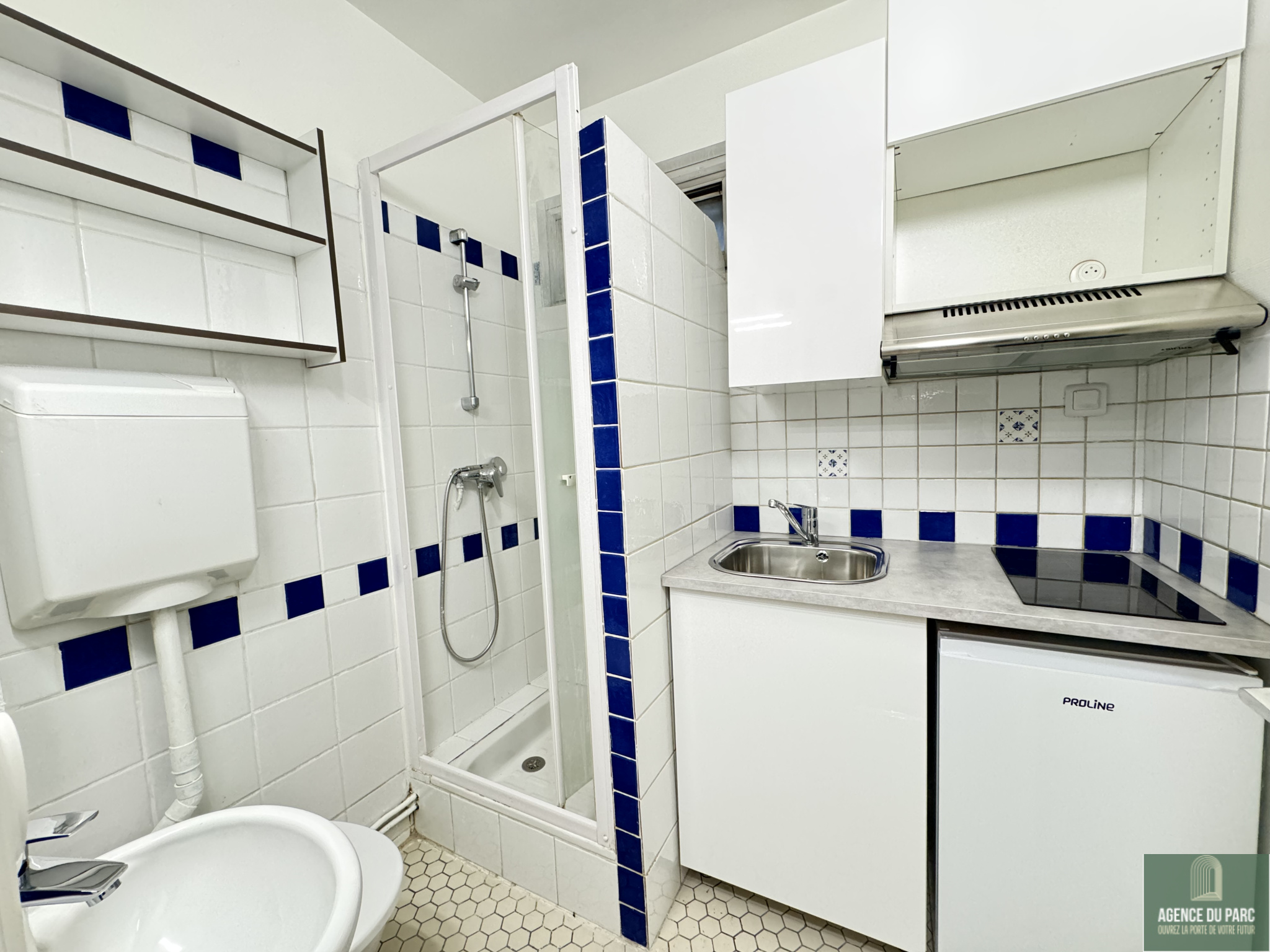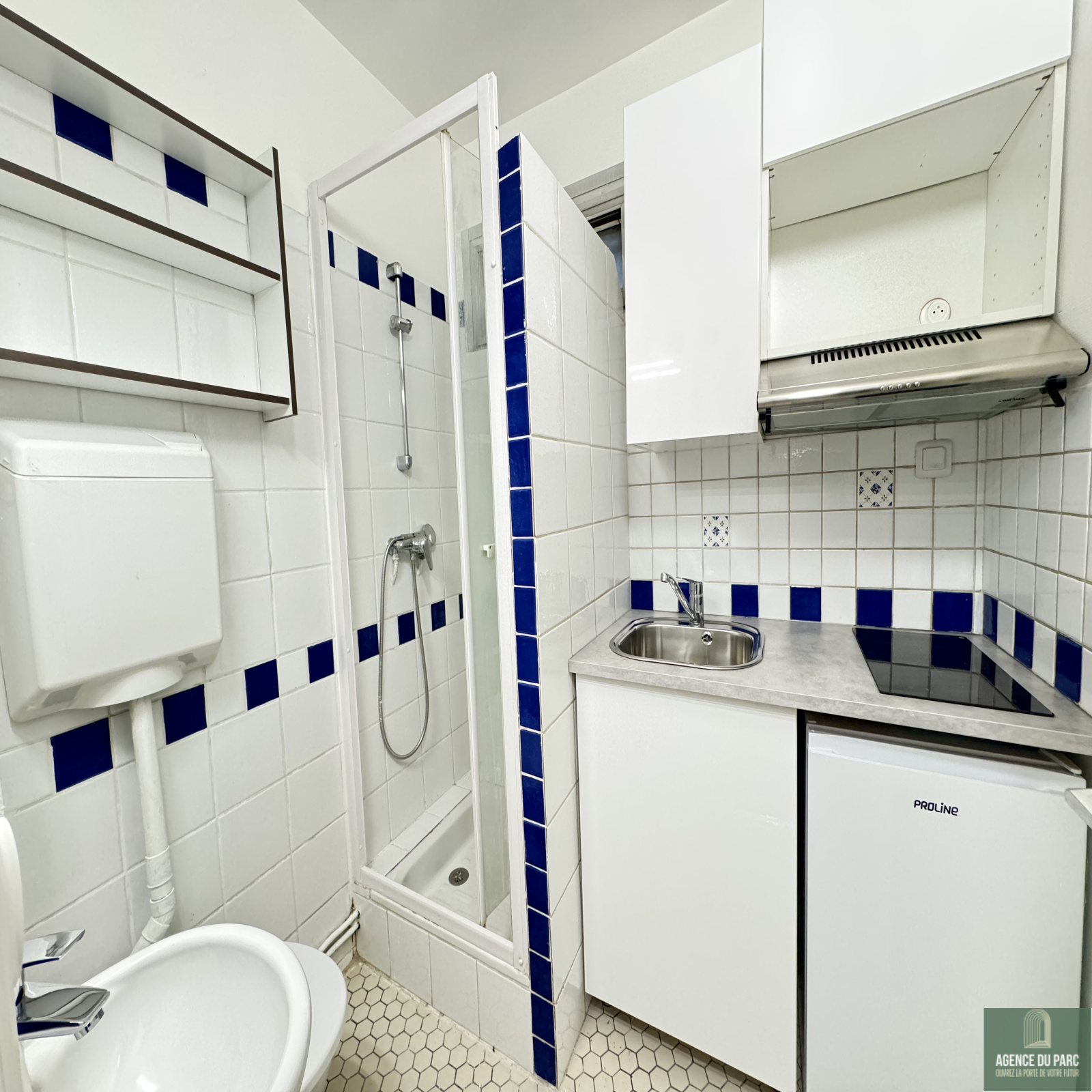Quartier du Val d’or, à proximité des transports : T2, Ligne L, Bus, l’Agence du Parc vous propose un joli studio refait à neuf dans une résidence de standing, comprenant une pièce principale avec une grande fenêtre donnant sur la verdure, volet électrique, un coin cuisine équipée (plan de travail, évier inox, plaque de cuisson deux feux, hotte, réfrigérateur, placards), une douche, un lavabo et un WC.